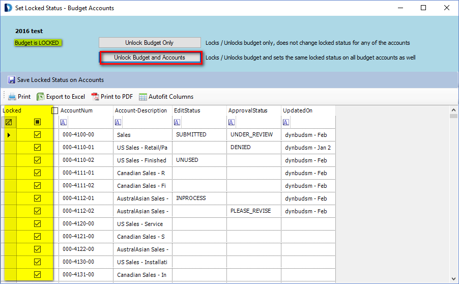 This is what the screen looks like after the button is clicked; namely the button is now the "Unlock Budget and Accounts" button, and it is noted "Budget is LOCKED" . As highlighted all AccountNums are now checked as Locked.