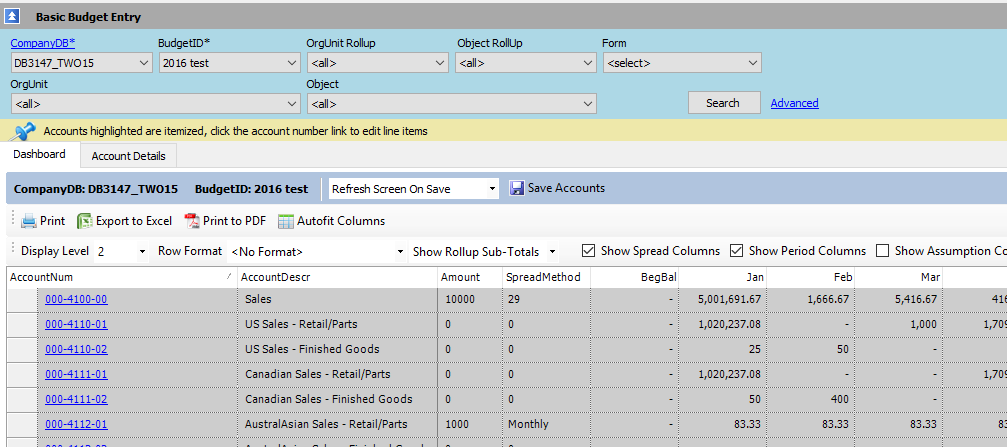 And AccountNums on the Accounts Detail tab available through drill - blue underline are available for data entry provided the AccountNum was not previously Locked like 000-4110-02 above.