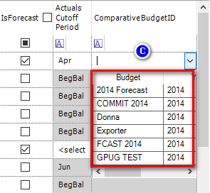 The dropdown menu displays all the BudgetIDs with the same "Year" as the "Year" of the Forecast which is "2014" and Source is "DynamicBudgets". It then uses the "Year" and the "Actual" column to be "True" to identify the BudgetID that will be used in the Forecast Actuals. In our example, the BudgetID for "2014 Actuals".