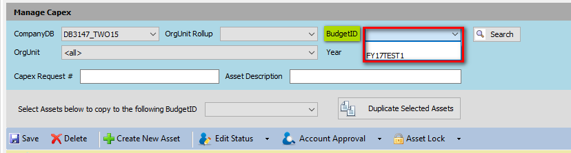 I. By checking the "InCapex" box for a given BudgetID, the BudgetID will be available for selection from BudgetID drop down menu in Manage Capex and Capital Expenditures Report.