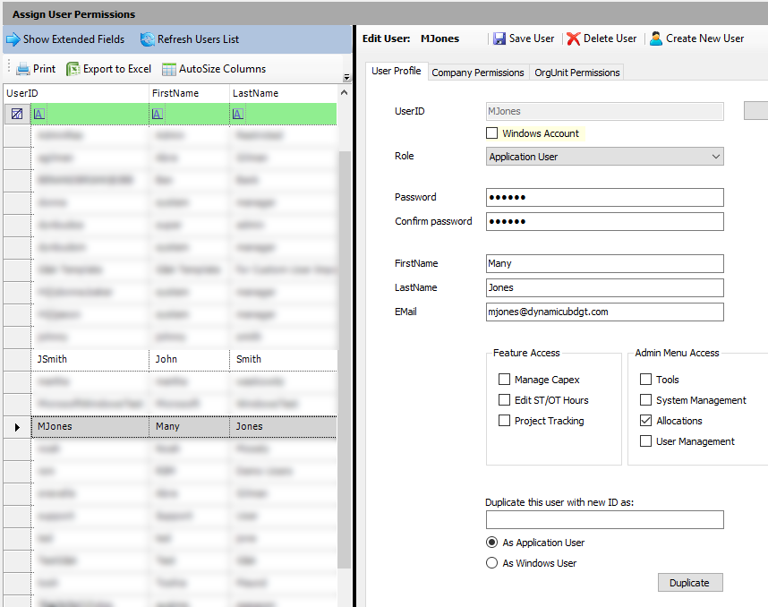 By navigating to Assign User Permissions, please note that the two new Users in our example were created and that their security settings are the same as that of the template.
